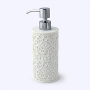 This soap pump dispenser features a subtle floral textured finish in a soft white.