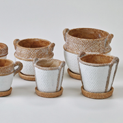 It's designed with a rope-like handle and textured basket weave pattern, each rustic planter has drainage hole and comes with a drip tray.