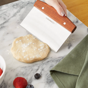 An essential tool for any kitchen, this bench scraper is made out of stainless steel and wood. This versatile scraper can be used for clearing sticky dough, cutting and scraping dough off a rolling pin.