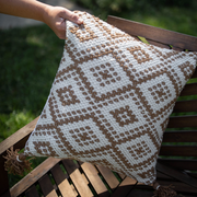 The Rook pillow features a southwestern geometric pattern in brown and white yarn. This pillow is perfect for outdoor entertaining or adding a statement pillow inside your home. It's finished with matching tassels on each corner. Suitable for both indoors and out and made of recycled plastic with quality you can feel.