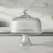 This beautiful two piece glass cake stand features a classic and bold ribbed texture design.