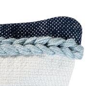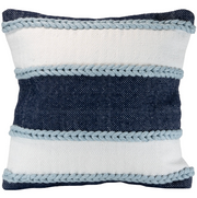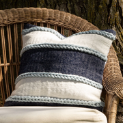 The Cindy pillow features bold woven stripes that are surrounded by lighter blue pulled yarns that add a bit of texture o the pillow. Suitable both indoors and out and made of recycled plastic with a quality feel.