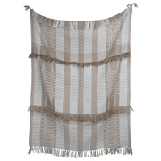 A neutral, taupe colored plaid that works indoors and outdoors all year round. Interrupted stripes create a unique,, all-over plaid pattern. The woven plaid is accented by multi-colored fringes and tassels.