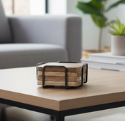This four piece coaster set features natural wood and a black metal stand to store them in.